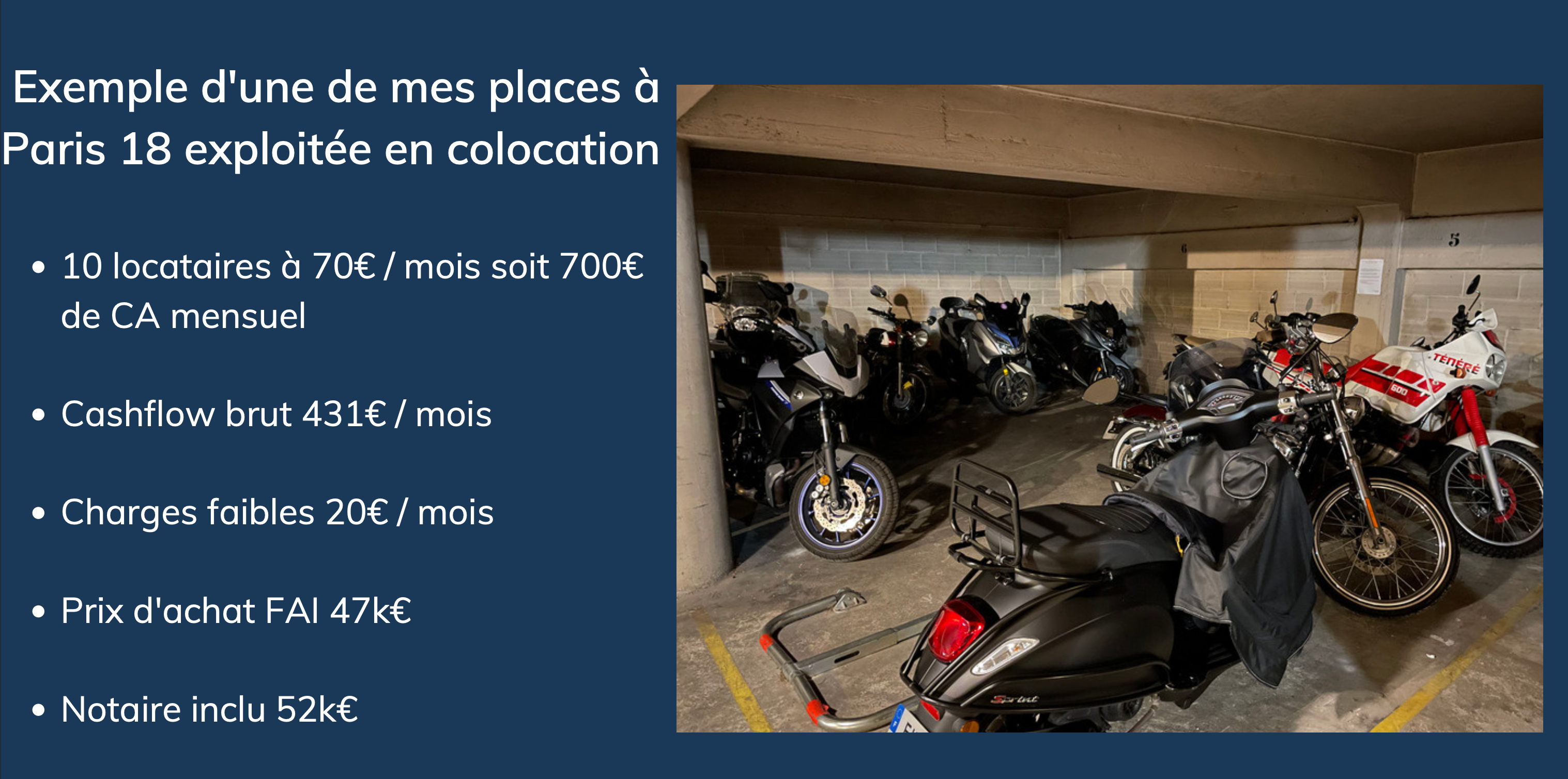 Qu'entendre par acheter malin ? C'est bien négocier son parking, être éclairé quant aux écueils dans lesquels ne pas tomber (pas de montes-voitures, viser les charges faibles etc...), mais également adopter une exploitation astucieuse comme la colocation de motos sur une place voiture (sur laquelle je suis expert depuis 2013)...Bref, tu seras armé.e pour apprendre à être autonome financièrement le plus tôt et rapidement possible.